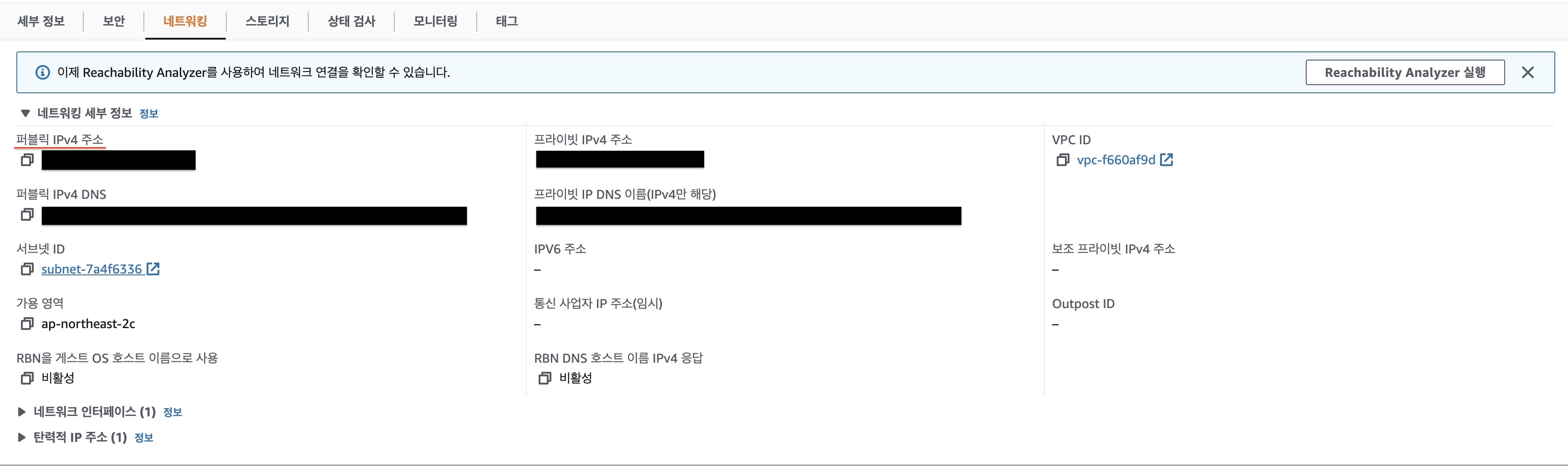 ec2 서비스 -> 인스턴스 -> 생성한 인스턴스 -> 네트워킹 -> 퍼블릭 IPv4 주소