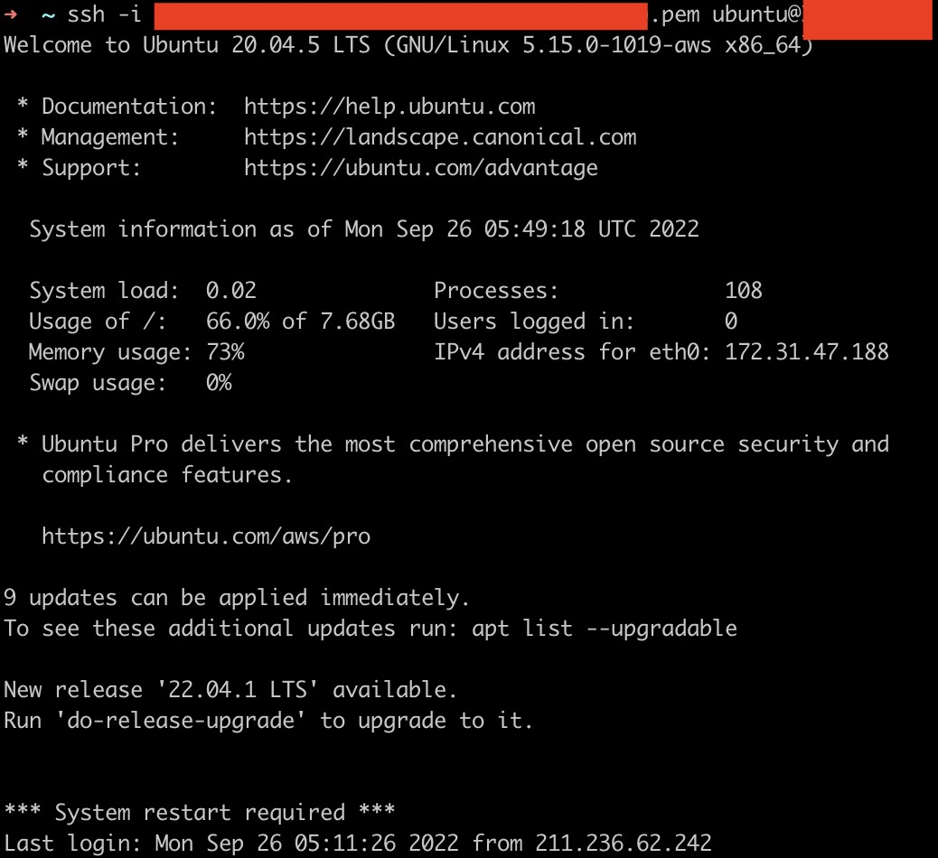 이제 key파일과 ip주소를 이용하여서 ssh로 접속을 하면 된다.