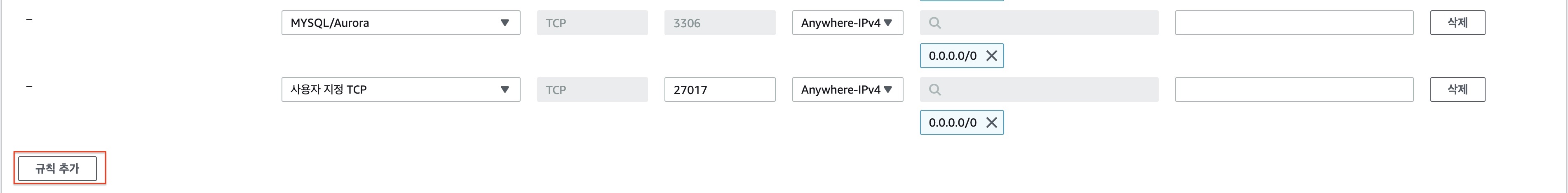 mysql의 기본 포트와 mongodb의 기본 포트를 인바운드 규칙에 추가하면 된다.