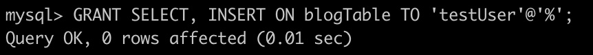 GRANT SELECT, INSERT ON 테이블 TO '유저'@'%';