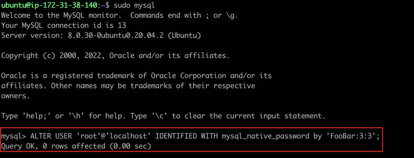 root 권한으로 mysql 서버에 접속 후 ALTER 명령어로 root 계정의 비밀번호를 변경한다.