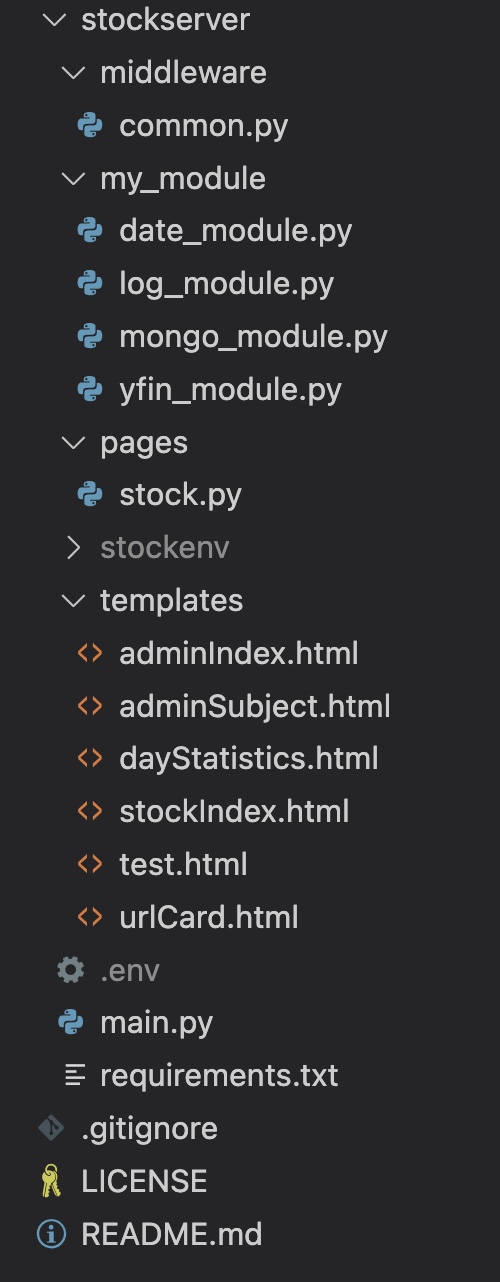 main.py(실행 파일), .env(환경 변수 파일), requirements.txt(의존성 목록)이 존재- stockserver/middleware: 미들웨어를 넣는 폴더