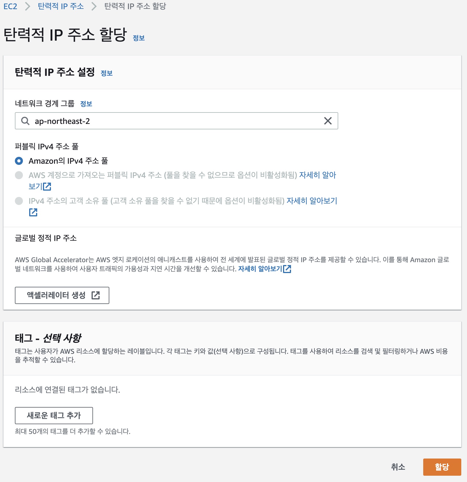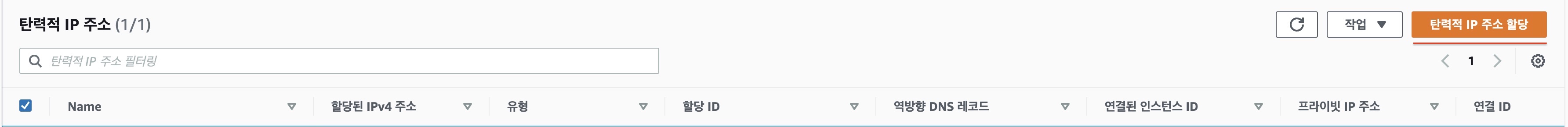 aws console -> EC2 서비스 -> 네트워크 및 보안 -> 탄력적 IP로 들어간다.